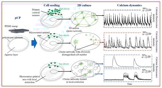 Among the bio-interface technologies, microcontact printing (CP) has gained popularity in reconstructing neuronal networks in vitro, owing to its ease of use, high throughput, versatility, and reusability [19,20,21,22,23]. The CP substrate can produce a substantially thinner cell adhesion molecule (CAM) layer because of the limited adsorption time and the protein transfer process, compared with directly coating cell adhesion molecules [24]. Such a thinner CAM layer reduces cell–substrate adhesion compared with CAM-coated substrates. Neurons formed a homogeneous network on substrates with high cell-substrate adhesion, e.g., a carpet of glia [25] or a thick layer of coated CAM [26], and reaggregated to form a 3D clustered network on substrates with low cell-substrate adhesion, e.g., untreated glass substrates [27] or ploy-D lysine precoated polystyrene surface [28]. Compared with other 3D neuron cultivation technologies, the CP-producing neuron network was relatively large-scale because of sufficient nutrient supplement and simple culture procedure. Moreover, the thickness of 3D structures on the CP substrates was relatively thinner than other 3D cultures, which allows a clear fluorescent observation to study the network calcium dynamics [29]. Studies have shown that the neuron-substrate adhesion [27], seeding density [30,31], and local topological restriction [3,8,32] will impact not only the morphology and structure but also the spontaneous calcium dynamics of cultured neuronal networks, which reflects the intrinsic functional connectivity within certain networks [33]. However, on microcontact-printed substrates, the combined influence of these factors on 3D network structure and calcium dynamics remains to be investigated.
