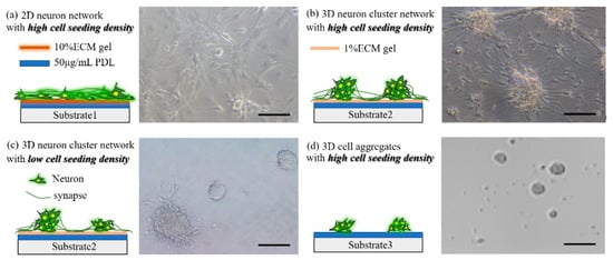 - Yoshida, S.; Kato-Negishi, M.; Takeuchi, S. Assembly and connection of micropatterned single neurons for neuronal network formation. Micromachines 2018, 9, 235. [Google Scholar] [CrossRef] [PubMed]