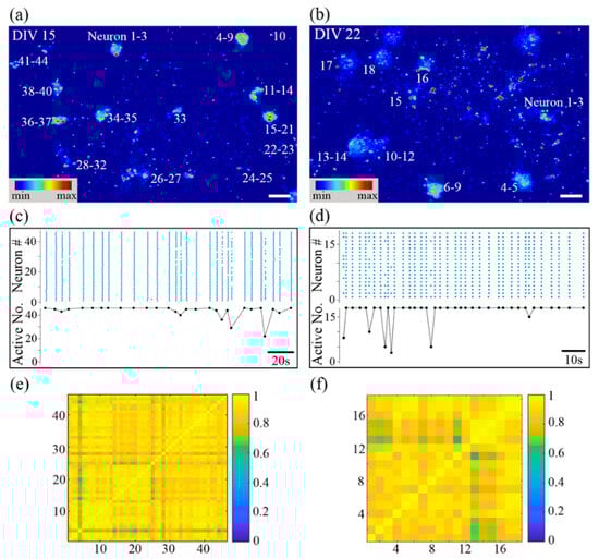 Calcium dynamics of 3D neuron cluster network with high cell seeding density on DIV 15 and DIV 22 are both dominated by synchronized network bursts. False-color fluorescence micrographs of the network on DIV 15 (a) and on DIV 22 (b). (c,d) Represent DIV 15 and DIV 22, respectively. Top panel: raster plot of neuronal bursts; bottom panel: number of active neurons in one subnetwork burst versus time. The matrix of CC on DIV 15 (e) and on DIV 22 (f). Scale bar: 100 µm.
