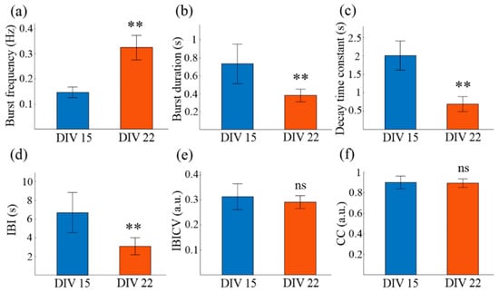 Characterization and comparison of the calcium dynamics of the 3D neuron cluster network on DIV 15 and DIV 22. (a) Neuronal burst frequency, the average number of neuronal bursts per neuron per second. (b) Neuronal burst duration, the difference value between the onset and the end time of a neuronal burst. (c) The fitted decay time constant of the calcium attenuation phase. (d) Inter-burst interval (IBI), the interval between two consecutive neuronal bursts. (e) Coefficient of variance of IBI (IBICV), the standard deviation of the IBI distribution across neurons divided by its mean value. (f) Correlation coefficient (CC). ** p < 0.01, ns indicates no statistical difference. Data are presented with mean ± SEM.