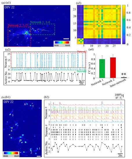 To investigate the impact of diminishing inter-neuronal attraction on network organization, we reduced the seeding density of primary cortical neurons from the high seeding density of 600 cells/mm2 to the low seeding density of 150 cells/mm2, with other variables remaining unchanged. In this sparsely seeded unpatterned group, owing to the relatively long distance between neurons, neurons did not form clusters in the first few days after seeding. With the proliferation and spread of neuronal supporting cells, neurons sprouted neurites and built synaptic connections in the next few days. Gradually, many weakly separated networks with obviously different cell numbers formed. They were only weakly separated because the gap between different networks could potentially be bridged with the further maturation of the culture. Such networks contained a number of neurons ranging from several to hundreds and typically colonized an area smaller than 1 mm2. In Figure 5(a1), the two cluster networks with high cell numbers were so close to each other that they could not be morphologically grouped as two independent networks. However, calcium dynamics revealed that the two networks burst non-synchronously. In Figure 5(a2), two burst patterns appear and they switch between each other randomly, indicating that the neural signal is not relayed between the two networks. Further analysis reinforced this hypothesis by showing a significant distinction in CC between the two networks (Figure 5(a3,a4)), and higher R2 in separate networks compared to the merged one. Such a phenomenon of two neighboring networks bursting asynchronously was only reported previously for cortical networks on geographically constrained substrates [20,42,43,44].