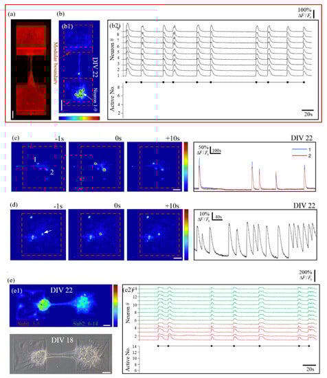 For the neuron cluster network in Figure 5a, there are higher cell numbers relative to the network in Figure 3, but network bursts could not be formed. We consider that low cell seeding density caused a low cell aggregation degree that could affect the generation of network bursts. It seems that networks with high aggregation degrees can induce network bursts because of the dense and more reliable inter-neuronal synapses, while less aggregated cell cluster networks could potentially present richer subnetwork activity patterns. To examine this hypothesis, we resorted to patterned µCP to confine neurons in desired areas and increase the aggregation degree. Meanwhile, other researchers have shown that symmetrically connected modular clustered networks also present dominant network bursts [20]. We wonder if asymmetry would break the reliable bidirectional signal transmission, hence allowing richer subnetwork bursts. To investigate this possibility at the same time, we changed the printing pattern to asymmetrically connected modular structures.