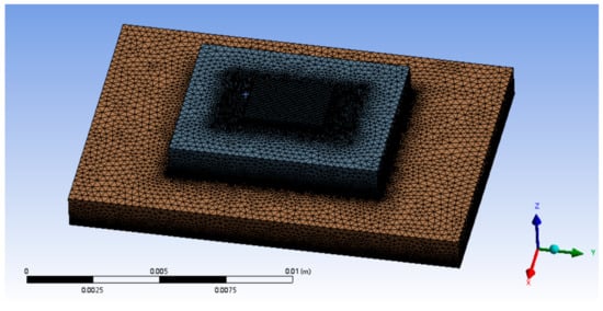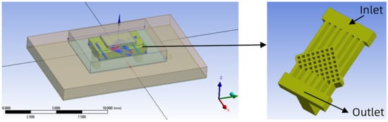 SBFEMCT is shown in Figure 1, with the arrow pointing to the embedded microchannel, which is embedded in the substrate beneath the chip. The size of the heat source chip is set to 3.5 mm × 2.2 mm × 0.2 mm. The operating temperature range is known to be 0 °C–70 °C for commercial chips and −40 °C to −85 °C for industrial chips. The heat flux of the chip is set to 0.5 [W]/Volume(chip)[cm3], which is approximately 330 [W/cm3] in the experiment. The heat flux density can be calculated as about 50 [W/cm2], and the maximum wafer temperature is obtained as 51.67 °C, which both meet the operating temperature requirements of the chip [26].