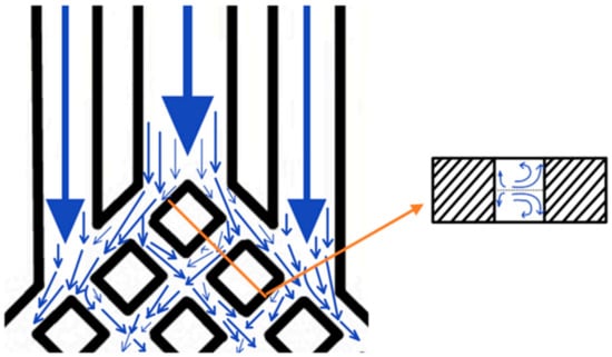 When a fishing net is pulled up from the sea, the grid is mostly diamond-shaped, and all the water in the net flows downward quickly along the sides of the diamond grid, because of the constant diversion and convergence of the mesh structure. Inspired by this, the microchannel is designed as a fishing net structure. In this paper, silicon is chosen as the structural material, water is used as the coolant, the height of the microchannel is fixed at 600 µm, and in order to improve the heat dissipation performance as much as possible, the width of the mesh-like flow channel is taken as 100 µm. The middle and back part of the microchannel is composed of the mesh-like diamond lattices, and the rest of the part consists of the flat microchannel connecting the inlet and outlet of the microchannel. The width of the flat microchannel at the entrance is determined by the diamond lattice on the diagonal side of the mesh flow channel closest to the entrance, and its width is equal to the distance from the node of the previous diamond lattice near the side to the node of the next diamond lattice near the side. The width of the flat microchannels at the outlet is determined by the other row of the mesh flow channel near the outlet and is equal to the width of the central axis of the rhombus. The middle 3 flat microchannels at the outlet and the 2 flat microchannels near the edge are suitably widened to reduce the pressure drop and increase the outflow rate. The flat microchannels at the inlet are aligned with the corners of the diamond lattice so that the cooling mass can be diverted whenever it enters the mesh microchannels, due to the bifurcation structure formed by the diamond lattice. After diversion, the cooling medium converges with the cooling medium already inside the mesh microchannel, and then diverges again due to the bifurcation structure. In addition, when the cooling medium is in the mesh microchannel, secondary fluid flow occurs when it hits the wall. The bifurcation phenomenon and the secondary fluid flow in the model of this paper are shown in Figure 2. Constant diversion and convergence can improve the effective contact area and force the coolant in the microchannels to enable lateral perturbation and doping between neighbouring microchannels, which leads to enhanced heat dissipation performance.