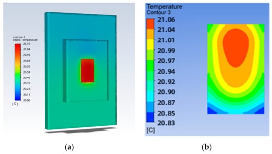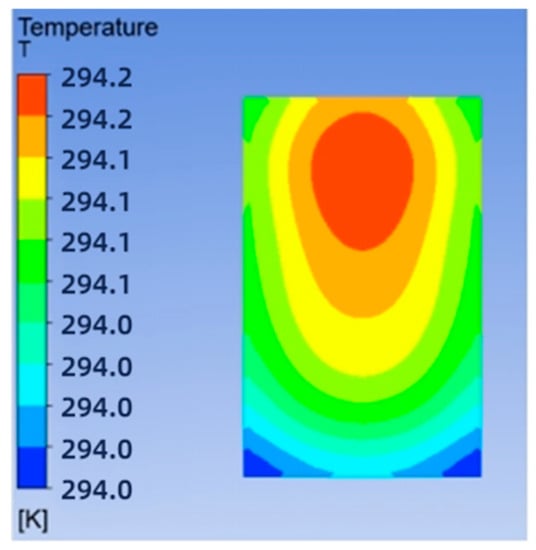 The appropriate heat flux value of the heat source is determined by a simulation experiment in a runnerless model. The size of the heat source chip is set to 3.5 mm × 2.2 mm × 0.2 mm. The operating temperature range is known to be 0 °C–70 °C for commercial chips and −40 °C to –85 °C for industrial chips. The heat flux of the chip is set to 0.5 [W]/Volume(chip)[cm3], which is approximately 330 [W/cm3] in the experiment. In the post-processor CFD-Post the heat source, i.e., the heat-generating chip, is selected individually to display its temperature cloud, and the maximum wafer temperature is obtained as 51.67 °C, which meets the operating temperature requirements of the chip.