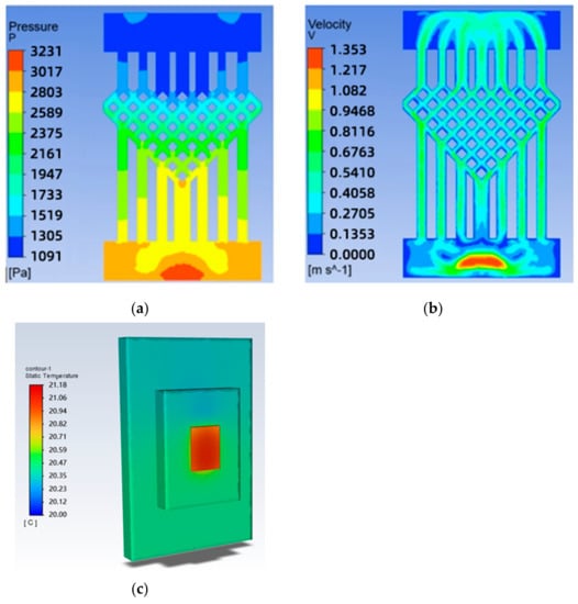 Figure 5. SBFEMCT flow channel pressure and velocity fields: (a) pressure field; (b) velocity field; (c) temperature cloud for the whole model.