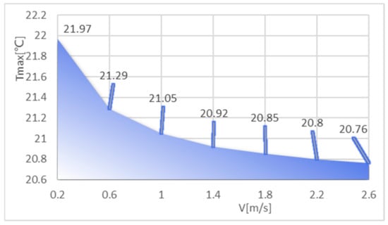 The coolant used in the model was aqueous, and the thermal performance of the model was analyzed by varying the inlet velocity value of the coolant. After meshing, the finite element model was obtained and Fluent was started according to the previous procedure, setting the heat flux of the chip to that of the no-fluid model, approximately 330 [W/cm3]. The pressure outlet was set to a relative static pressure of 0. The surfaces of both the substrate and the solder layer were set to adiabatic wall surfaces. The inlet temperature was set to 20 and the inlet flow rate was set from 0.2 m/s to 2.6 m/s to analyze the effect of flow rate on the heat dissipation effect of the chip embedded. The maximum chip temperature, maximum air pressure in the flow channel, and maximum flow rate at different flow rates were obtained as shown in Table 2, and Figure 6 shows the maximum chip temperature at different flow rates.