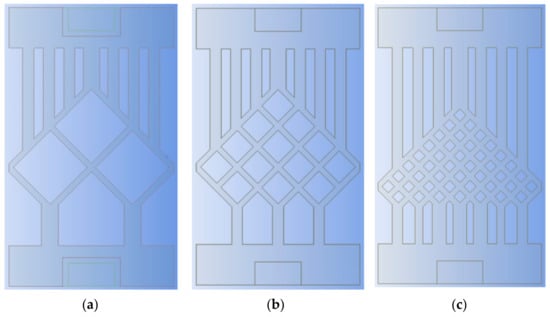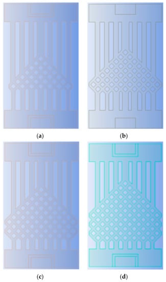 As the flow channel is symmetrical, the mesh density ratio of the mesh flow channel is defined as the inverse of the number of lattices in the top left-hand diagonal row of the mesh flow channel. For example, in the model in Figure 4, there are eight lattices in the top left-hand diagonal row of the flow channel, so the mesh density ratio of the flow channel is 1/8 = 0.125.