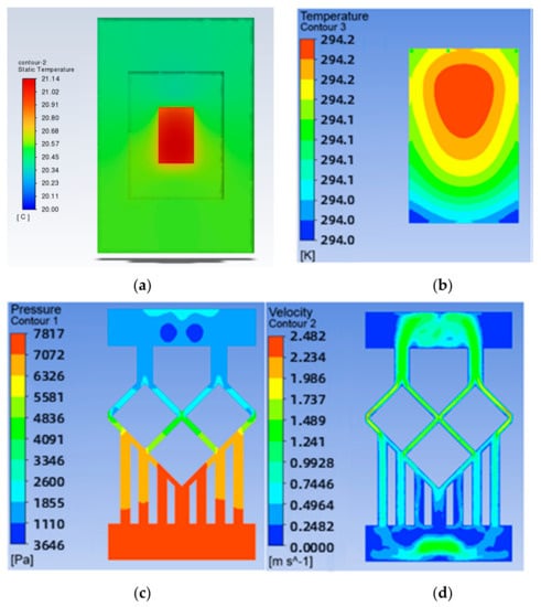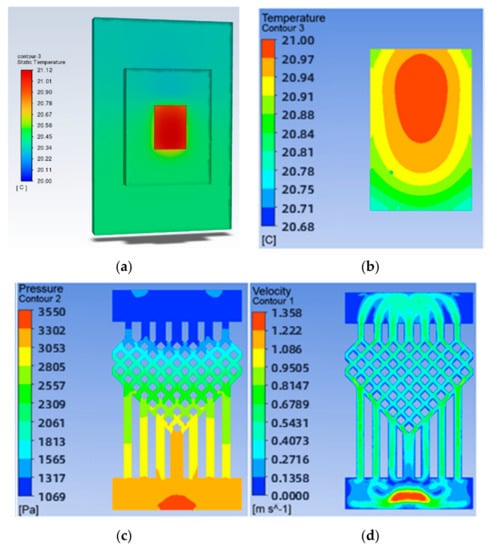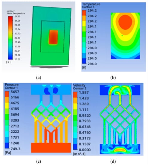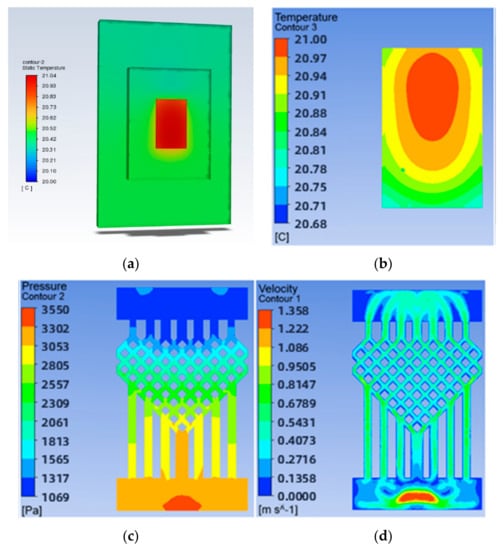 Figure 9. Results for a mesh density ratio of 0.250: (a) Temperature cloud for the whole model; (b) Temperature field at the chip; (c) Pressure field at the runner; (d) Velocity field at runners.