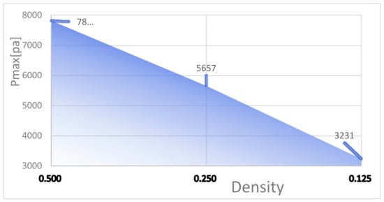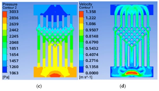 To study the effect of the mesh density ratio on the heat dissipation effect of the chip inside the mesh flow channel part of the model, four sets of flow channels with different mesh density ratios were designed without major changes to the overall shape of the mesh flow channel and with the same width of the mesh flow channel. Namely, a mesh size of 0.9 × 0.9 with a density of 0.5, a mesh size of 0.4 × 0.4 with a density of 0.25, a mesh size of 0.15 × 0.15 with a density of 0.125, as shown in Figure 7. The flow channel with a mesh size of 0.15 × 0.15 and a density of 0.125 is the model shown in Figure 2, and its results are shown in Figure 4 and Figure 5. The results of the models with mesh size densities of 0.5 and 0.25 are shown in Figure 8 and Figure 9. The flow and heat transfer characteristics were simulated at an inlet velocity of 1.0 and the parameters obtained are shown in Table 3. The maximum pressure drop and maximum velocity of the flow channel were chosen as the characterization objects, as shown in Figure 10 and Figure 11.