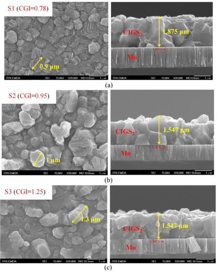The top view (left) and cross-sectional view (right) of SEM images with the CIGS2 absorber layer for the CGI ratios are: (a) CGI = 0.78 (Cu-poor), (b) CGI = 0.95, and (c) CGI = 1.25 (Cu-rich), respectively. The grain size (from 0.9 to 1.3 μm) increases with copper content for crystal thickness in the range of 1.547~1.875-μm.