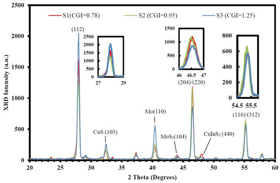 The X-ray diffractograms (under the 5° incident angle) are mainly in the deeper part of the CIGS2 absorption layer with different CGI ratios. The 2θ values of the main diffraction peaks appear at 27.9°, 46.5°, and 55°from zoom-in patterns (inserted images), respectively, on (112), (204/220), and (116/312) facets. The secondary-phase signal is located at CuS (103) at 32.38°, Mo (110) at 40.5°, MoS2 (104) at 44°, and CuInS2 (440) at 48.06°.