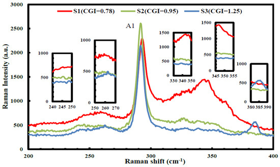 The Raman spectra of CIGS thin film absorption layer prepared with different sample of S1, S2, and S3, which contain various concentrations of Cu-Au ordering, in which the Raman main-phase signal (A1) falls at 291 cm−1, which is excited by the 532 nm line of Ar+-laser.