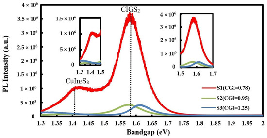 At same modulation source as Raman spectra on CIGS2 thin films, Figure 4 plots the energy bandgap (eV)—the photoluminescence (PL) spectra measured at the 600–980 nm wavelength transmission. Therein, the Cu-rich with samples S2 and S3, the main peak displaced to about 1.59 and 1.61 eV, which was possibly induced by the secondary phase of CuS (103) at 32.38° (shown in XRD pattern of Figure 2) [16]. In the lowest CGI-ratio film (sample S1), it did not have an obvious peak. The samples S2 and S3 showed the obvious and wanted peak at 1.59 and 1.61 eV, respectively. However, sample S1 had the unwanted peak at 1.41 eV of CuIn5S8, thus increasing defect density of the CIGS2 film in concurrence with the literature reports [19].