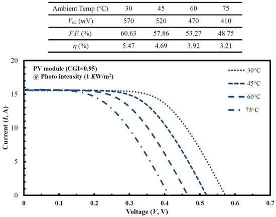 Under the fixed photo intensity (KW/m2) for the optimal CIGS2-solar cells prepared with a PV module (CGI = 0.95), the current-voltage (I–V) curves observed from different ambient temperatures (30~75 °C).