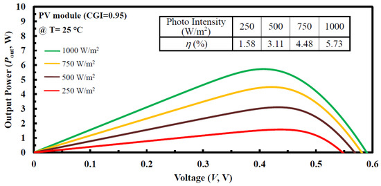 As photo intensity increased, again, the incident photo energy was absorbed more because a greater percentage of the incident light had enough energy to raise charge carriers from the valence band to the conduction band [23]. For a PV module (CGI = 0.95), Figure 8 illustrates the output power (W) relation with voltage (V), and it showed a linear upward trend with the gradual increase in photo intensity (from 250 to 1000 W/m2). On the contrary, this was the positive-photo-intensity effect of VOC value, which, in turn, led to a raise in its η value (from 1.58% to 5.73%), which was consistent with the findings in [23].