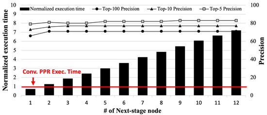 As a motivational experiment, we evaluated the performance and energy efficiency of the conventional PPR and the state-of-the-art PPR technique (i.e., MeLoPPR by Li et al.) [16] on real-world edge devices (i.e., Nvidia Jetson AGX Xavier, Santa Clara, CA, USA) [25]. Figure 2 shows its execution time and top-k accuracy (i.e., k = 5, 10, and 100) compared to the conventional PPR, depending on the number of second-stage nodes of MeLoPPR; the details on our experimental environment will be described in Section 4.1.