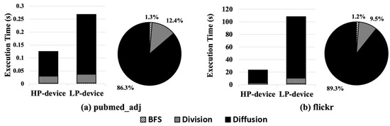 In the case of pubmed_adj (Figure 4a), due to the small size of the graph, the execution time of the BFS and Division process is not much different between the HP and LP edge devices, while that of the Diffusion process shows a significant difference in execution time between the devices. On the other hand, in the case of flickr (Figure 4b), which is much larger than pubmed_adj, the execution time increases significantly (>5×) in the LP edge device compared to the HP edge device. The reason for this is that the larger graph causes a longer execution time in the Division and Diffusion processes, whereas it results in a negligible difference in the BFS.