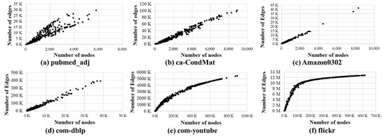 Figure 5 shows the analysis of the relationship between the number of nodes and edges in subgraphs when constructing subgraphs using BFS and the Division process using the SNAP dataset [26].