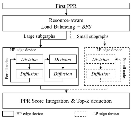 First, HedgeRank computes the PageRank scores on a subgraph within the distance l1 from the starting node and calculates the first PPR to find the top-k nodes (i.e., the next-stage nodes). Next, to distribute the second PPR calculations considering the resource ratio of edge devices, BFS is executed within the distance l2 for all the next-stage nodes. According to the results from the BFS, we are able to obtain the number of nodes participating in the second PPR. In addition, the calculation overhead in Division and Diffusion can be predicted by the number of nodes in the subgraphs. Thus, we can distribute the subgraphs into HP or LP edge devices by considering the resources of the edge devices. Finally, each edge device computes Division and Diffusion for the assigned subgraphs. The computed scores are gathered on the high-performance edge device to determine the top-k nodes.