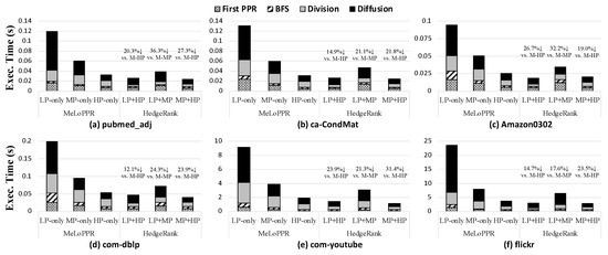 Figure 8 shows the execution time of HedgeRank for three different configurations compared to that of MeLoPPR; in the Figure 8, x% ↓ indicates execution time reduction, while the x% ↑ means execution time increase. As shown in Figure 8, for a relatively small graph dataset, such as pubmed_adj and ca-CondMat (Figure 8a,b, respectively), the performance difference between the different edge devices is not that significant as they have fewer nodes and edges. Nevertheless, in the case of pubmed_adj (Figure 8a), HedgeRank (LP + HP) improves the execution time by 20.3% compared to MeLoPPR with HP-only (denoted as M-HP in Figure 8). On the other hand, the large graph datasets such as com-youtube and flickr (Figure 8e and f, respectively) have a much larger number of nodes and edges than the others. Thus, such a large graph would be processed faster in the HP-device leading to better performance. As a result, in the case of flickr (Figure 8f), HedgeRank (LP + HP) reduces the execution time by 14.6% compared to M-HP. In all the cases, HedgeRank (LP + HP) outperforms M-HP as it efficiently partitions subgraphs into different edge devices based on our resource-aware load balancing. In summary, HedgeRank, with LP + HP devices, provides a 12.1%~26.7% shorter execution time than MeLoPPR with HP only. Meanwhile, HedgeRank must be better than MeLoPPR because our HedgeRank exploits two different devices for PPR execution while MeLoPPR only uses a single device. More importantly, HedgeRank reduces energy consumption compared to MeLoPPR as it distributes the PPR subprocess to the different edge devices by considering their computation capabilities and graph sizes.