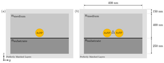 To evaluate the optical properties of the AuNPs, numerical modeling was performed in COMSOL Multiphysics 5.6 [17]. The hardware used was an Intel Core i5-10500 3.10 GHz CPU, and the installed memory capacity (RAM) was 16 GB. The physical 3D geometry is modeled by a box containing a substrate, spherical AuNPs, and a surrounding medium. For numerical reasons, a Perfectly Matched Layers (PML) is added to mimic an open and nonreflecting infinite domain. Optical properties of PMMA were assigned to the substrate to mimic an optically transparent material. Two systems were modeled, one with a single AuNP, shown in Figure 1a, and one where two AuNPs were separated by a distance ds shown in Figure 1b.