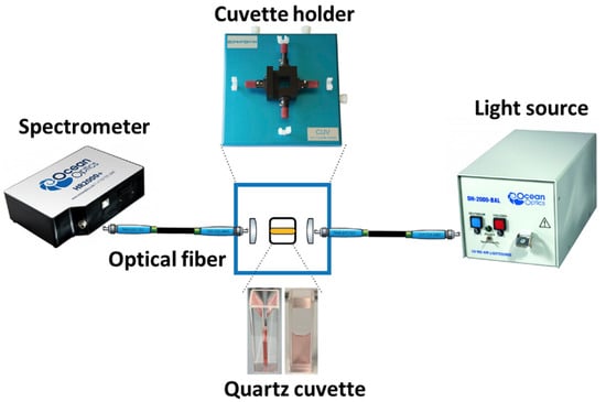 The experimental setup is shown in Figure 2. It consists of an ocean optics CUV-UV cuvette holder with a 1 cm pathlength quartz cuvette. For measurement of the absorbance spectra, a tungsten halogen lamp and a spectrometer are connected to the CUV-UV cuvette holder via optical fiber cables with SMA connectors.