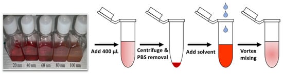 The following supporting information can be downloaded at: https://www.mdpi.com/article/10.3390/mi14091717/s1, Figure S1. Picture of AuNPs in different solvents with average diameter (a) 20 nm, (b) 40 nm, (c) 60 nm, (d) 80 nm, and (e) 100 nm. Figure S2. Experimental absorbance spectra of AuNPs in different solvents with nanoparticles with average diameter (a) 20 nm, (b) 40 nm, (c) 60 nm, (d) 80 nm, and (e) 100 nm.