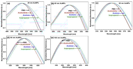 Experimental UV-VIS spectra of AuNPs in different solvents with nanoparticles with average diameters of (a) 20 nm, (b) 40 nm, (c) 60 nm, (d) 80 nm, and (e) 100 nm.