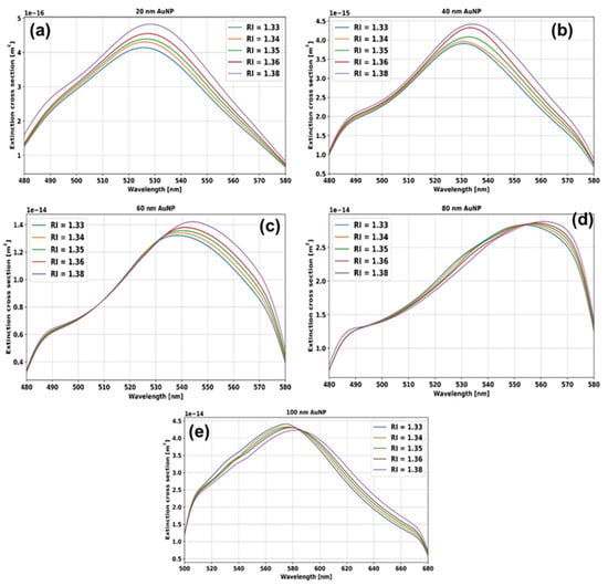 Simulated extinction spectra of AuNPs in different RIs with nanoparticle diameters of (a) 20 nm, (b) 40 nm, (c) 60 nm, (d) 80 nm, and (e) 100 nm.