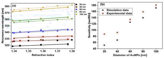 The extinction curves of d = 20, 40, 60, 80, and 100 nm AuNPs at different RI mediums are shown in Figure 5. The resonance wavelengths of AuNPs in different solvents were extracted from Figure 4 and Figure 5, and the data points are plotted in Figure 6. Figure 6a shows the simulated (dotted line) and experimental (solid line) relation between the RI of the surrounding medium and the resonance wavelength for d = 20, 40, 60, 80, and 100 nm AuNPs. By fitting these data points, the RI sensitivity has been calculated for different sized nanoparticles by calculating the slope of the fitting data points. The graph between resonance wavelength and RI looks linear in Figure 6a. The error bars in the experimental points were calculated by taking the standard deviation of the resonance wavelengths obtained after repeating the measurements three times. It is notable that the sensitivity of the nanoparticles is size-dependent and increases with the size of the AuNPs. The numerically and experimentally found sensitivities of d = 20, 40, 60, 80, and 100 nm AuNPs are shown in Figure 6b. For small-size AuNPs, the simulated and experimental results deviate the most because these particle sizes are less uniform. For d = 60, 80, and 100 nm sized nanoparticles, the experimental and simulated values are in better agreement. The absorbance curve of AuNPs starts from 55 to 60% of the maximum absorbance value. Therefore, we have not calculated the FWHM but the full width of the absorbance curve at 60, 70, and 80% value of maximum absorbance. We have calculated the full width of the LSPR absorbance of d = 20, 40, 60, 80, and 100 nm AuNPs at these absorbance levels. The trend of the absorbance curve width for d = 20, 40, 60, 80, and 100 nm AuNPs in the experiments and simulations are similar. The absorbance curve width increases with the size of the AuNPs, which increases the uncertainty of the peak absorbance wavelength and, hence, decreases the RI sensing accuracy.