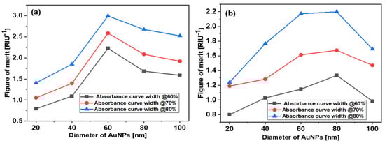 Figure 7a shows the simulated values of the FoM for the d = 20, 40, 60, 80, and 100 nm AuNPs, while Figure 7b shows the experimental values for the same. As can be seen, the experimental and theoretical FoM data points for different sized nanoparticles also present similar trends. Initially, the FoM increases with the size of AuNPs and then decreases. From simulation, the best FoM was observed for the 60 nm AuNPs. The experimental FoMs are also in good agreement with the simulated results, and the d = 60 and 80 nm AuNPs show the best FoM. These results indicate that, for spherical AuNPs, around d = 60–80 nm AuNPs give a better FoM. For different shapes, such as rods, stars, cubes, and prisms, it could be different.