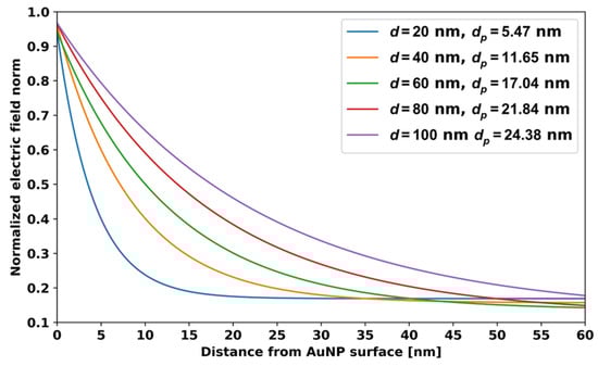 LSPR electric field and penetration depth dp for AuNPs with different d.