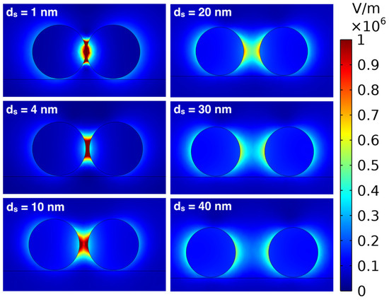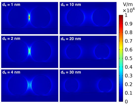 In Figure 11 we can see that, in this case, when ds = 20 nm, the electric fields start to interact and at around ds = 10 nm, and the electric field is very high in the middle between the particles. The electric field further enhances as the distance between the d = 60 nm AuNPs decreases, and it is extremely high for very small distances (ds = 1 and 4 nm).