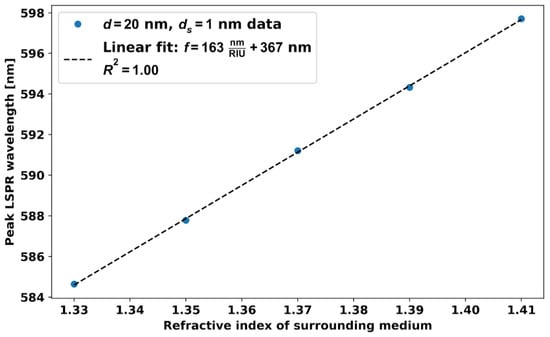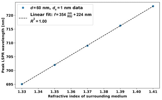 Figure 12 shows resonance wavelength with RI around the 60 nm AuNP dimer separated by 1 nm. With this ds = 1 nm distance, the sensitivity is 2.8 times higher compared to the single d = 60 nm AuNPs, and it is 2 times higher compared to the AuNPs dimers of diameter d = 20 nm. The gap between the two nanoparticles (dimer) can be controlled by various methods, such as DNA origami [23,24] and solid phase approaches [25,26].