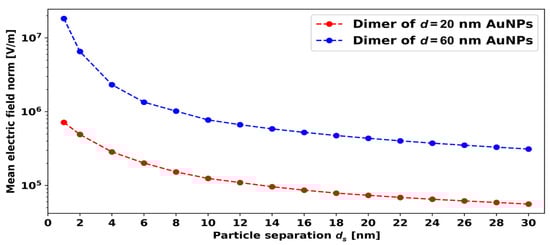 Mean electric field norm between AuNPs versus interparticle distance for the d = 20 nm and d = 60 nm AuNPs.