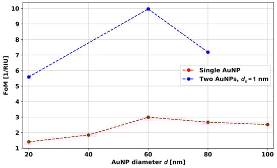 Figure 14 presents the simulated FoM for dimers of AuNPs with d = 20, 60, and 80 nm and ds = 1 nm. For the calculation of the FoM, the absorbance curve width was calculated at 80% of the maximum value of absorbance. The FoM of spherical AuNPs and dimers show a similar trend with d, i.e., the single AuNP with d = 60 nm and the dimer with d = 60 nm give the best FoM. The 3-fold enhancement in FoM can be achieved by maintaining the ds = 1 nm distance between the AuNP dimer particles.