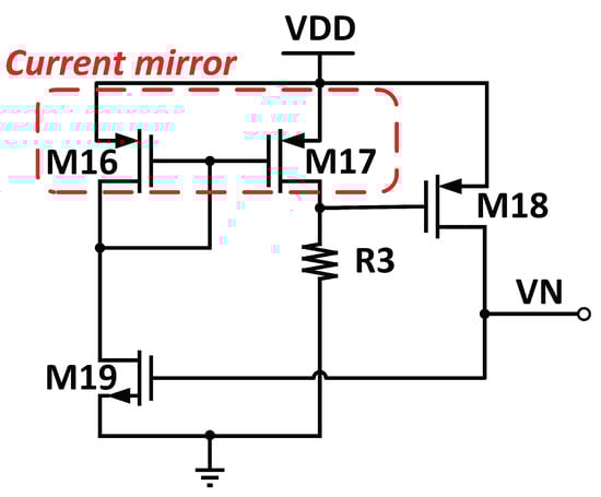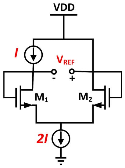CMOS and bandgap reference are the two types of circuits widely used to provide a stable reference voltage through the process, voltage, and temperature (PVT) changes. MOSFET devices will be used in the CMOS reference circuit to represent the complementary to absolute temperature (CTAT) [1,2] and proportional to absolute temperature (PTAT) [3] characteristics. The MOS transistor’s threshold voltage, Vth, determines the reference voltage while holding the CTAT characteristic with minimal temperature dependence on BJT. The simplified CMOS-based conventional voltage reference generator is depicted in Figure 1.