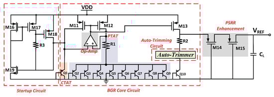 Figure 2 depicts the ATBGR schematic. A BGR Core (CTAT, PTAT, and op-amp), a startup circuit, a PSRR enhancement circuit, and an auto-trimming circuit are integrated. The auto-trimming circuit generates a consistent reference voltage across CMOS process variations.