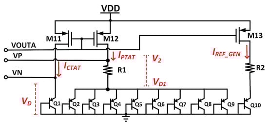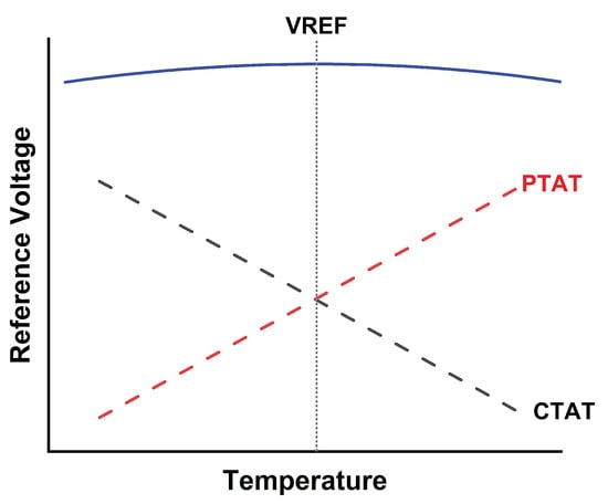 Referring to Figure 4, the correct pairing of the CTAT and PTAT can eliminate temperature-dependent variations and result in a stable and temperature-independent reference voltage. CTAT and PTAT node’s potential voltage is ideally equal, as shown in Equation (2).