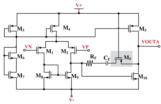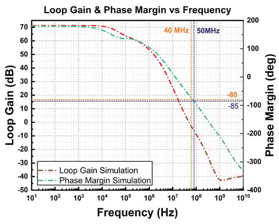 Referring to Figure 5, the integrated MF acts as an AMC for the high-gain op-amp. Operating comfortably in the saturation region due to high overdrive gate voltage from VDD contributes to higher active RC, which is inherited from MF. Higher RC moves the dominant pole away towards low frequency, thus improving the phase margin. Figure 7 illustrates the simulation results of the two-stage op-amp’s corresponding open-loop gain and phase margin. The maximum achieved is 64 dB with a phase margin of 60°.
