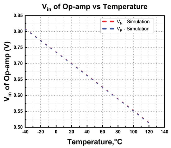 In our BGR, a two-stage op-amp is used to achieve the design goal of equal CTAT and PTAT potential differences. The schematic of the design is illustrated in Figure 5. If the amplifier detects inequality, the output of the amplifier will trigger the gate of current mirror M8 and M9 to increase the drain current to equalize the voltage differences. Figure 6 illustrates the simulated input voltages of the amplifier across the temperature. The simulated input voltages of the amplifier exhibit linear characteristics from −40 °C to 125 °C while generating the reference voltage with CTAT and PTAT. A stable and constant output voltage is produced because CTAT and PTAT are tied to each amplifier node.