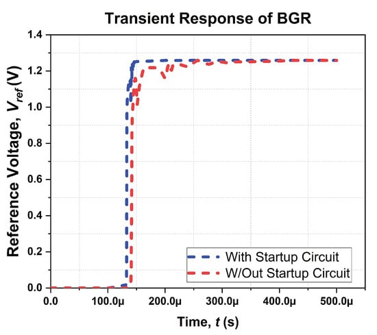 The ATBGR quickly reaches a steady state after the startup circuit exits the zero-current region. On the other hand, without the startup circuit, it takes longer to reach a steady state, as depicted in Figure 9, as the amplifier’s input node was initiated by itself to break the zero-current region.