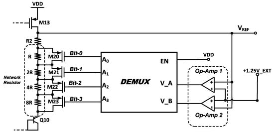 Figure 10 illustrates the auto-trimming circuit integrated into the ATBGR to resolve the reference voltage variation issue across the process. R2 is used for the trimming purpose, referring to (12). A 4-bit trimming circuit has been integrated with R2. The value of the resistor is an increment from one to another in multiples of two, that is, R, 2R, 4R, and 8R, each connected in parallel to the PMOS switches M20–M23. PMOS is favorable over NMOS, as it exhibits reduced process sensitivity.