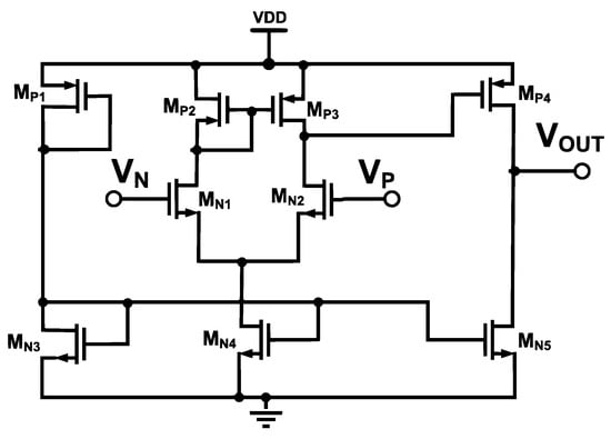Op-amp 2 is used to determine whether the output voltage was less than the external voltage. When the output voltage is less than the external voltage, the op-amp will set. The output of the BGR was connected to its negative node and an external voltage, +1.25V_EXT, is connected to the positive node. When the output voltage of the BGR exceeds the external reference voltage, the resistors R and 2R are configured, whereas larger resistances, such as 4R and 8R, are configured when the output voltage is lower. The transistor-level schematic of the op-amp is shown in Figure 11.