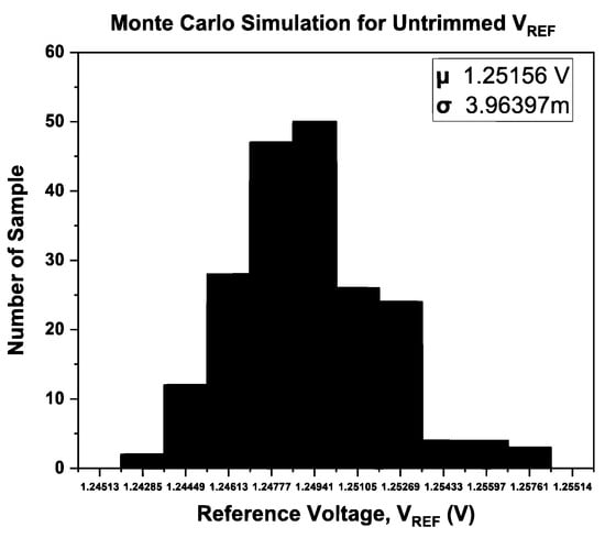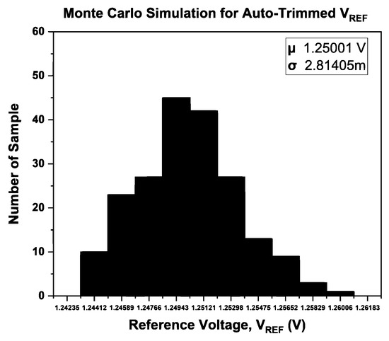 Referring to Figure 12 and Figure 13, the BGR with ATC achieves VREF with higher precision (1.25001 V) than without ATC (1.25156 V). According to the findings, the ATBGR with ATC-distributed data is close to the mean value compared to the ATBGR without ATC. ATC has resulted in a normal distribution. Furthermore, the latter has a lower standard deviation than the former.