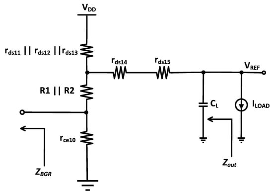 In the figure, Zout is the output impedance of the BGR and ZBGR is the shunting effect of its feedback loop. Zout and ZBGR are given as follows: