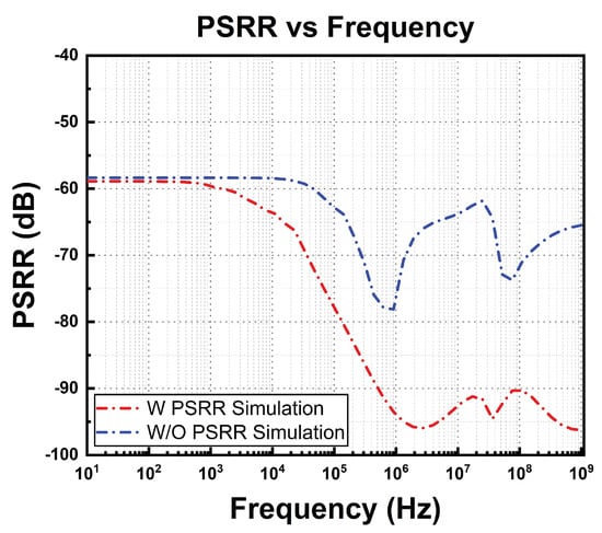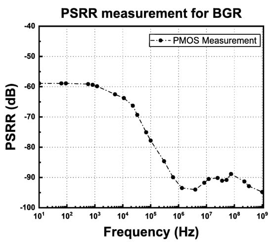 The measured results of the PSSR of the proposed BGR circuit are shown in Figure 21. The PMOS PSRR enhancement circuit helps to optimize the PSRR of the BGR circuit across the frequency, especially in the higher frequency range.