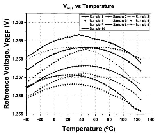 To validate the proposed BGR design, a total of 10 samples of the chip were measured. The 10 samples are selected from various wafers that fall under the FF, TT, and SS speed grades. Figure 17 shows the output voltage of BGR with a temperature range from −40 °C to 125 °C with a supply voltage of 3.3 V. The BGR was designed to generate 1.25 V as an output voltage. The output voltage of the proposed BGR has a deviation smaller than 1.278 mV across the temperature ranging from −40 °C to 125 °C. Based on the 10 samples, the minimum and maximum temperature coefficients are 6.11 ppm/°C and 15.32 ppm/°C, respectively, with power supply ranges from 1.65 V to 4.5 V. The proposed BGR core circuit only consumes 16.4 µA when the input supply is 3.3 V.