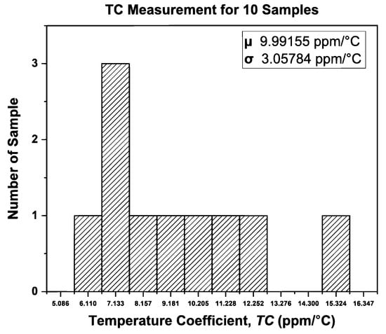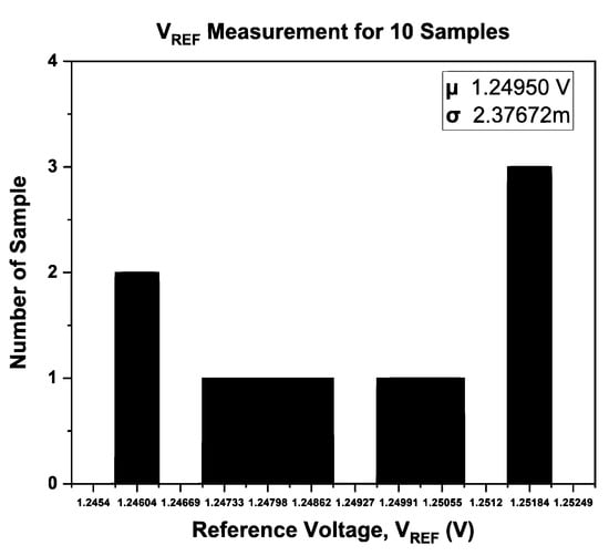 The performance distribution of the proposed BGR for the ten samples after trimming was extracted from Figure 17 and Figure 18, and the distribution of VREF and the temperature coefficient is shown in Figure 19 and Figure 20, respectively. Figure 19 illustrates the measured mean output reference voltage at room temperature, that is, 1.2495 V with a standard deviation of 2.38 mV. The measured TC distribution is depicted in Figure 20 and has a mean value of 9.99 ppm/°C and a standard deviation of 3.06 ppm/°C.